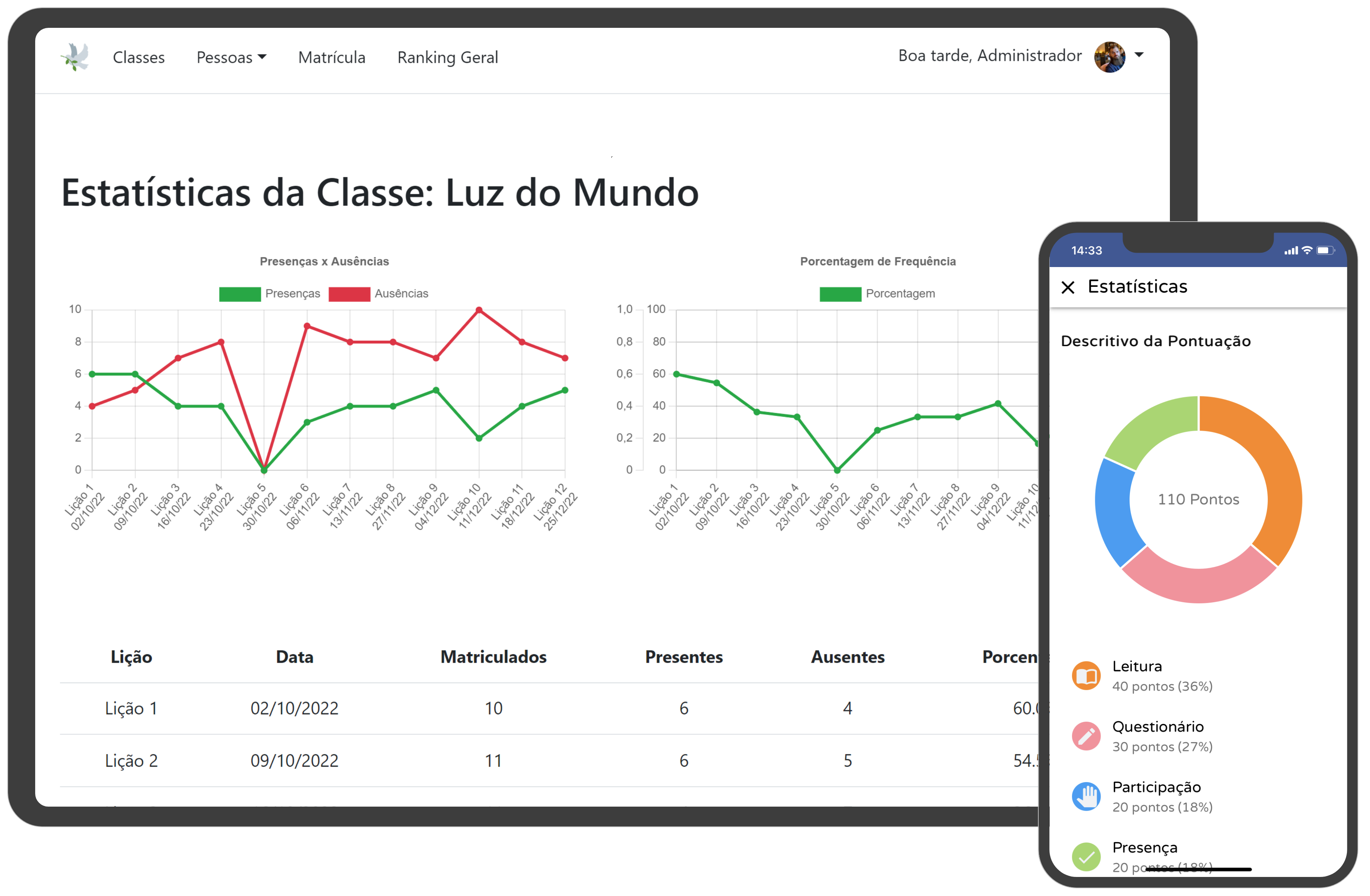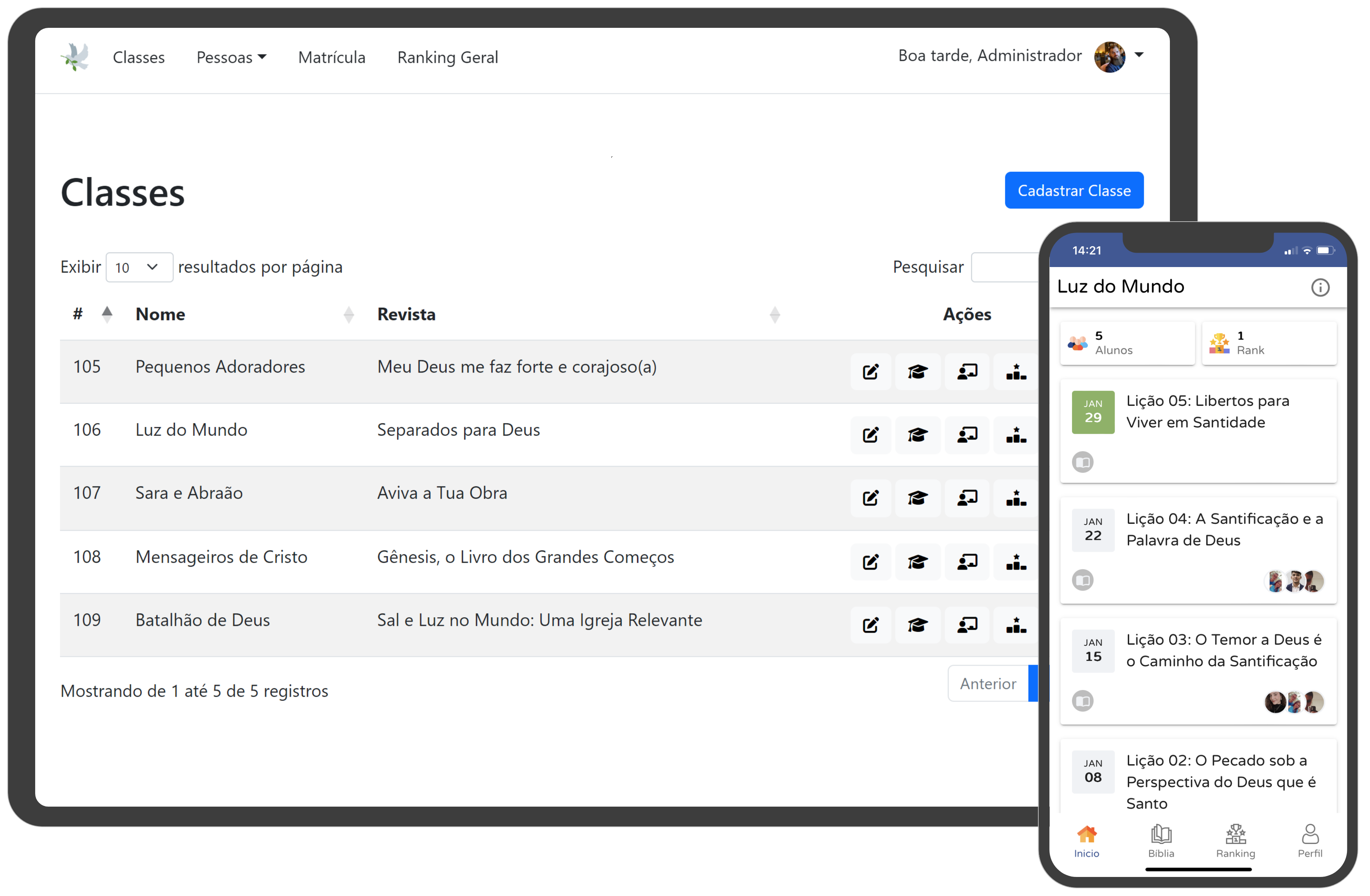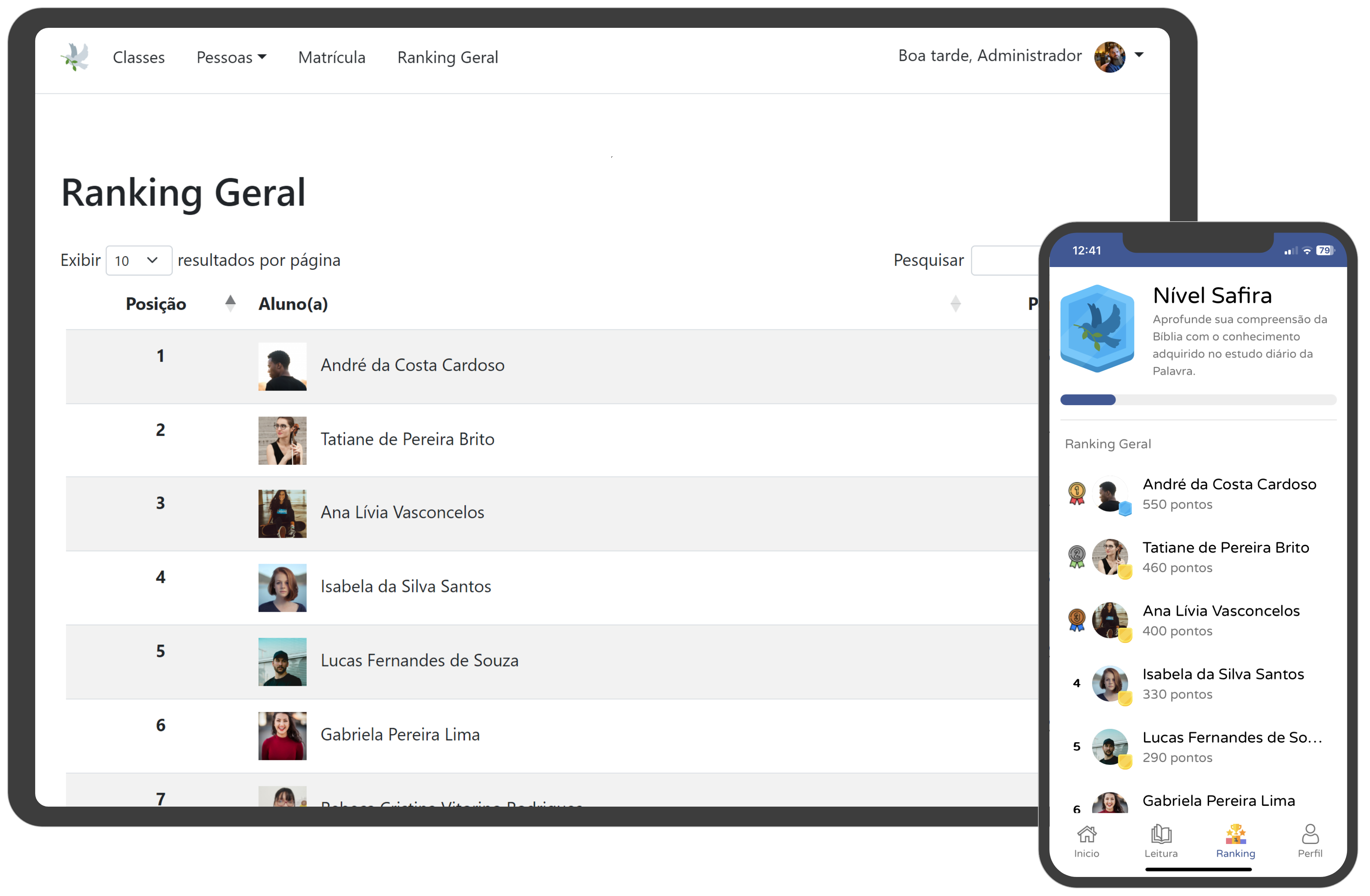 Uma solução completa para escolas de ensino bíblico que buscam engajar seus alunos e ter um gerenciamento online e eficiente, acompanhando o desenvolvimento de alunos e professores em tempo real. Como bônus, economize com pranchetas e papéis.
